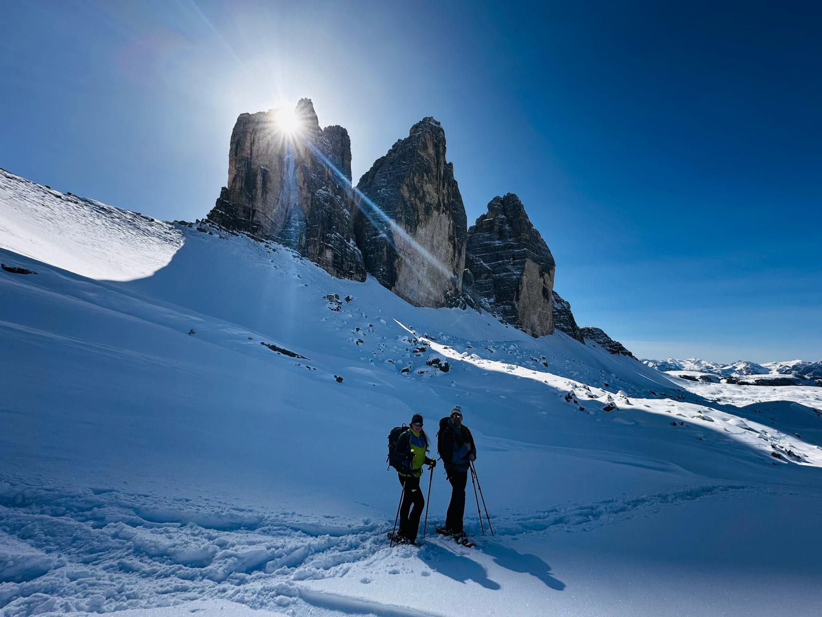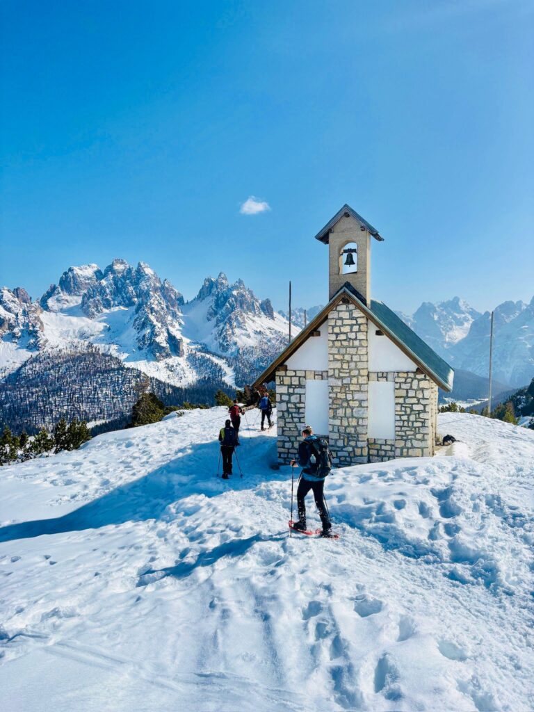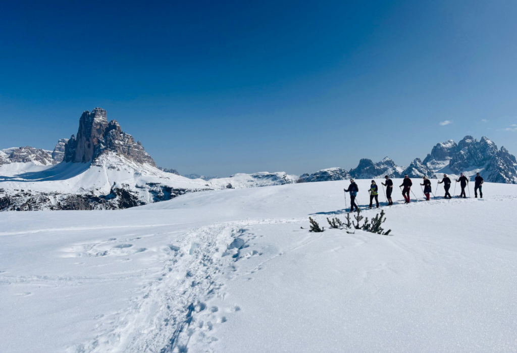 Okružní túra kolem ikonických věží Tre Cime - celkem 7 km, ↑ 200 m, ↓ 200 m s využitím sněžných skútrů k Rif. Auronzo a sáněk.