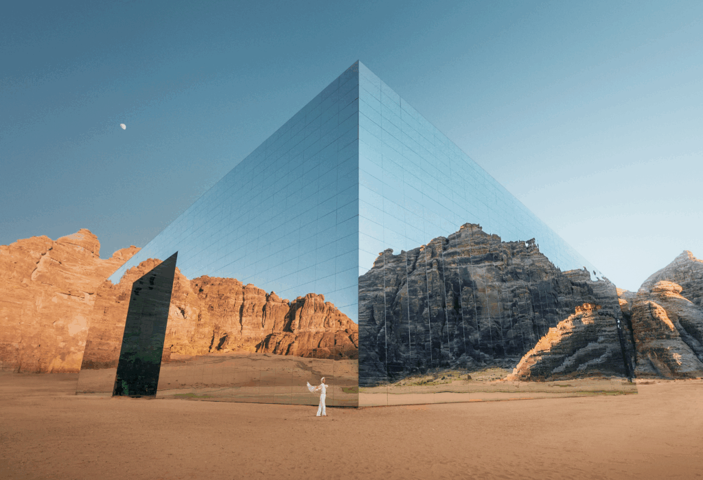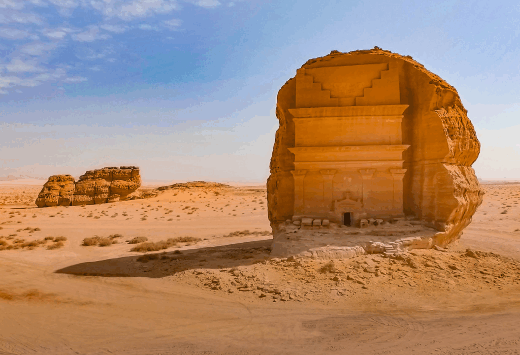 Túra pouštní krajinou, archeologické naleziště Hegra, slavná nabatejská hrobka "saúdská Petra" Mada'in Saleh(UNESCO), skalní útvary a proslulá zrcadlová pouštní budova Maraya.